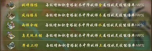 北村其余建筑(乌灵玩具铺、摩云工坊、娴婵猫馆、风伯膳房、雨师伞铺)可消耗西村生产的资源来进行建设,能够增加相应五行妖灵的技能倍率,帮助通关积雷塔,具体数据详见上表。