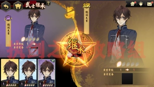 ①选择SSR鹤间大吉→点击左下角”继承“,此时继承武士会出现在游戏右侧。