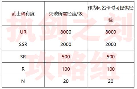 不过被继承武士依旧会保留对应的技能突破等级的现有经验。继承武士则可以利用被技能武士进行技能突破。比如上面举例的SR鹤间大吉方块技能吸收了5个R级鹤间大吉提供的经验(5*100点)提升至2级,在继承结束后SR鹤间大吉方块技能仍会保持2级,而在作为同名卡被SSR鹤间大吉技能突破吸收时,则会提供他本身(500点)+他所吸收经验(5*100点)共计1000点经验转移至SSR鹤间大吉身上。武士技能突破和作为同名卡可提供经验一致,具体经验如下:
