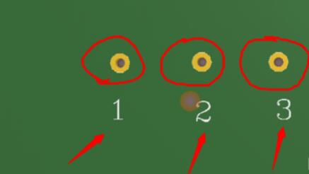 第三步,为了方便我们的比较,我们先在PCB板上放置如下所示的三个过孔,那么这三个过孔做出的PCB板实际是什么样子呢?