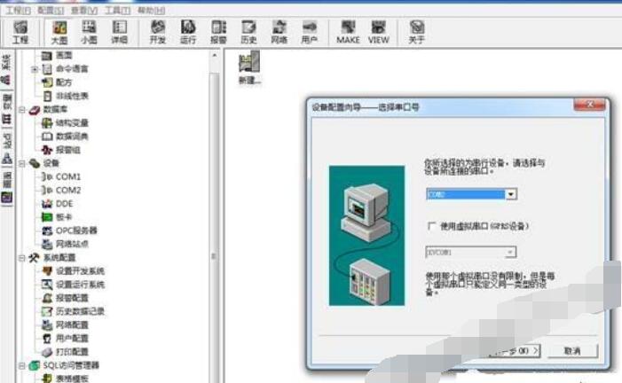 3、逻辑名称命名为新IO设备,串口默认为COM2,这里选择哪个COM口都是可以的,因为用的是USB的下载线,如果是使用串口的通信线我们需要选择实际通信的COM口。点击下一步。