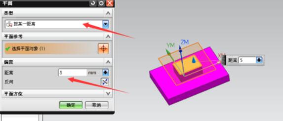 类型:按某一距离,然后点击模型最上边面,我们把偏置距离改为5,点击确定。回到MCS对话框,再次点击确定,完成加工几何体的创建。