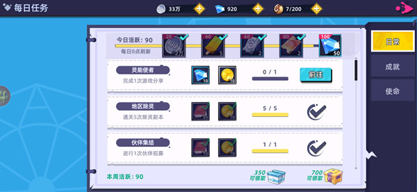 在每日任务这一界面中,玩家可以看到自己当前的目标达成情况和活跃度的累计情形,拿满活跃可领钻石等奖励。