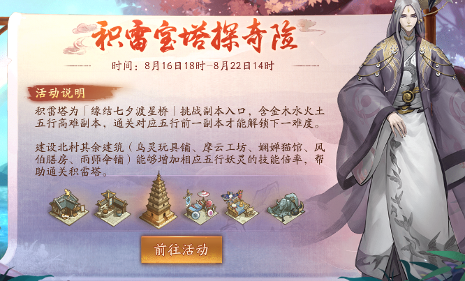 积雷塔立于积雷山的东北角,是七夕活动缘结七夕渡星桥挑战本的入口,内含金木土水火五行高难副本,共25层,通关对应五行前一副本才能解锁下一难度的副本。