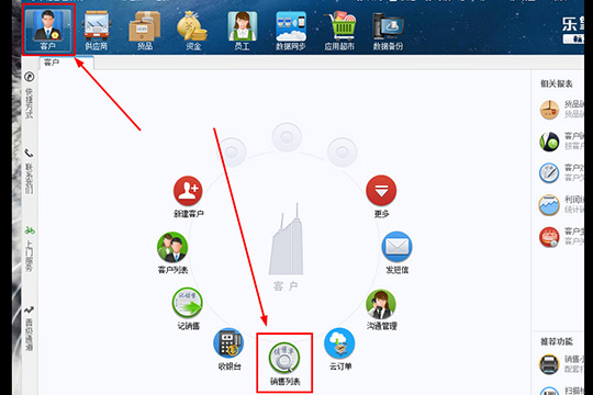 1、乐掌柜根据每位用户的职责进行了精确的分类,大家可以在上方的栏目中找到自己类型,小编默认选择“客户”一栏,软件针对围绕“客户”提供了各种功能,其中红框标注内的“销售列表”功能正是今天的主角,直接点击它即可开始进行销售列表的删除,如下图所示: