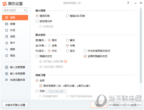 3、在搜狗输入法的属性设置界面可以看到有很多设置的选项,点击界面左侧的“高级”选项,在界面右侧可以看到有自定义短语设置选项,点击它进入下一步