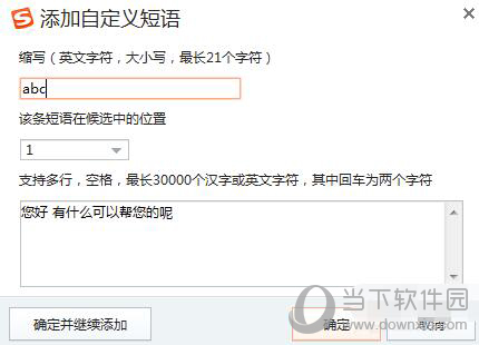 5、在添加自定义短语界面,可以在缩写下的框中输入你想要的快捷短语缩写,在设置该短语在候选中的位置,最后在最下方的选项框中输入快捷短语代表的快捷语言,如图。我们设置“您好 有什么可以帮助您的呢”的快捷短语为“abc”