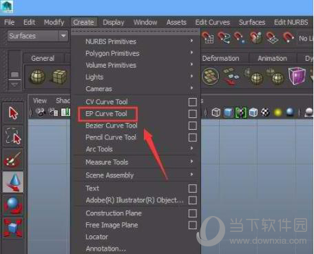 3、点击create选项,在其下拉菜单中找到EP curve tool选项