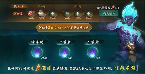 大人可凭借「河伯许愿笺」于大典前预测选秀结果,预测成功即有机会赢取无支祁限定异闻外观「尘缘尽散」、玉璧等奖励。
