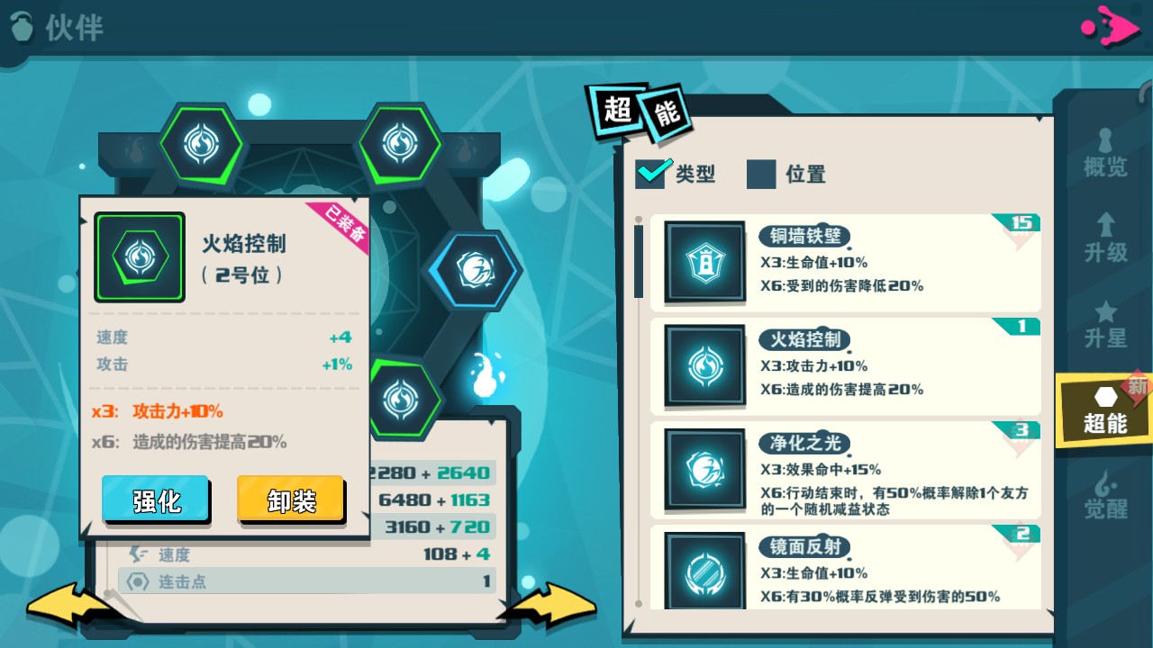 跟上述方法同理,根据伙伴的技能搭配相关的超能,会收到出其不意的效果。