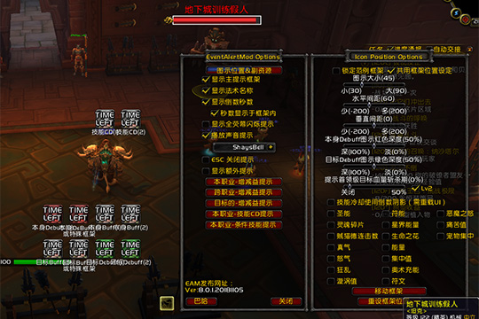 4、回到刚刚的“技能特效报警”设置界面,直接,接着点击右边窗口的“移动框架”功能,可以看到当前人物的位置出现了技能CD、本身BUFF与目标BUFF栏,最后只需移动BUFF到合适的位置,即可完成监控buff的全部内容,如下图所示: