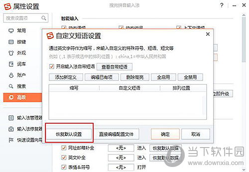 如果你输入了rq而没有输出系统日期,那么就要设置一下输入法将其恢复默认配置。打开【选项卡】→【高级】→【自定义短语设置】→点击【恢复默认配置】就设置成功了,接下来你输入首字母就可以打出当前日期了。
