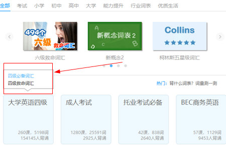 2、该界面精细的区别的各个考试所需要的单词,用户可以根据自身的英文水平或者准备的考试选择背诵的单词