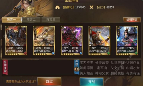当我们点击开战后会进入阵容编辑的这个界面,在这个界面是有跳过功能的,并且要求了战力,如果右上角的战力达到标准即可跳过,所以如果是土豪爸爸们,