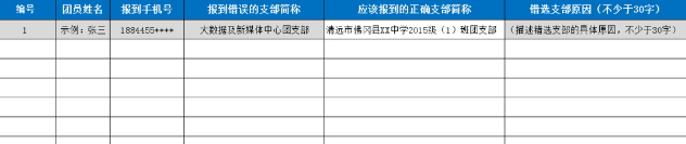 1、团员报到时选错团支部或者是写错了团组织的名称,需按照表中内容把姓名、手机号码、报到错误的支部简称以及应该报到的正确支部简称,发给要报到的团支部组织管理者(团支书、运营者)。