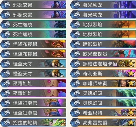 这套牌加入了跟班连动,能透过怪盗征募官或黑暗法老塔卡恒使其变成具有威胁的随从,也可以补充手牌数,使自己能够打出更低费的山岭巨人。招虫的地精也有相同效果,且送11嘲讽也能够干扰对面进行一些生物交换。