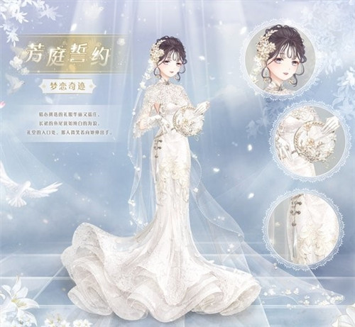精心挑选的礼服华丽又端庄,长裙的鱼尾犹如纯白的海浪。