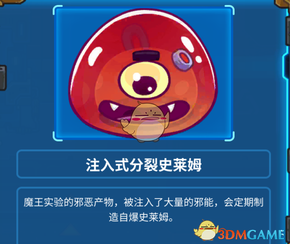 第三个就是史莱姆啦,史莱姆的攻击方式单一,只会使用跳跃攻击,原生史莱姆和自爆史莱姆威胁不大,但挑战房间的史莱姆(就是下面这货)会分裂很多自爆史莱姆如果放任不管,自爆史莱姆会越来越多。