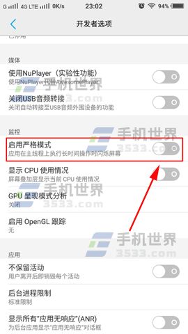 2)接着我们再点击进入【开发者选项】功能,如果没有这个选项可以点击这里查看方法;然后找到【启用严格模式】点击旁边的按钮即可开启功能。(如下图)