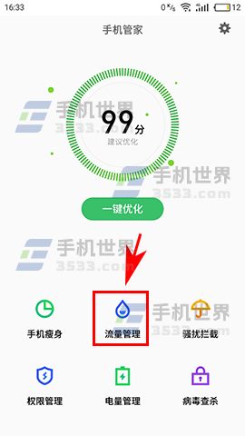 1)打开手机自带的【手机管家】应用,进入手机管家后点击打开【流量管理】。(如下图)