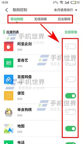 2)接着点击【联网控制】,这时就能看到应用列表了,在界面上方还有联网类型选择,选择要管理的联网类型,再把应用对应的开关关闭,这样就能禁止该应用联网了。(如下图)