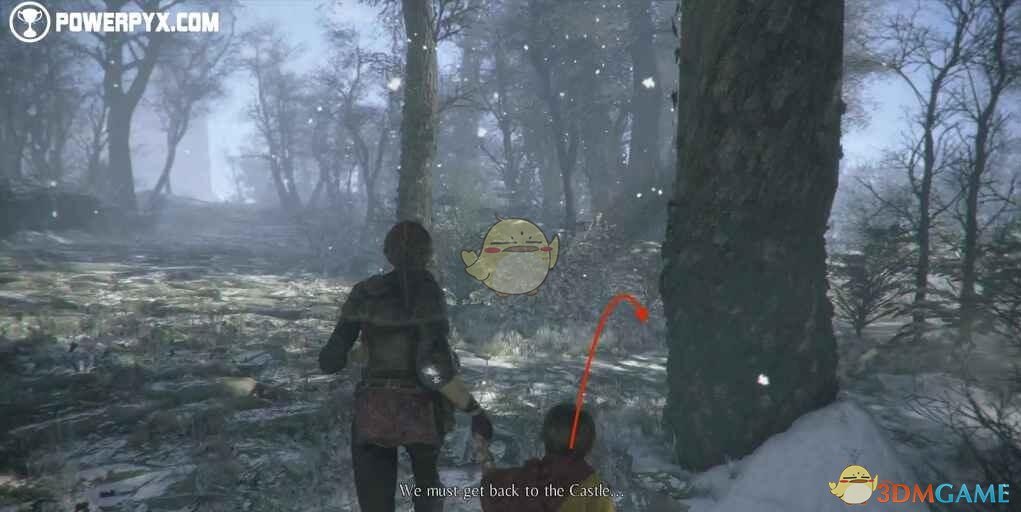 解救【雨果】之后立即在右侧两棵树之间的开口处找到此收集品,【雨果】会向它所在的方向走。