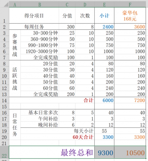 以上表格为赛季积分值获得项目,根据自身条件和目的来选择吧。