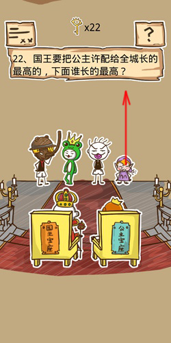史小坑的烦恼5第22关国王要把公主许配给全称长的最高的,下面谁长的最高?是那个匹诺曹吗?当然没有这么简单,来看看怎么找到最高的吧。