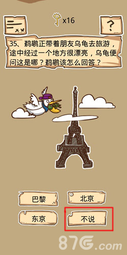 史小坑的烦恼5第35关鹈鹕(di hu)正带着朋友乌龟去旅游,图中经过一个地方很漂亮,乌龟便问这是哪?鹈鹕该怎么会的,肯定是不说,因为说话放开了嘴,乌龟老弟就掉下去了。