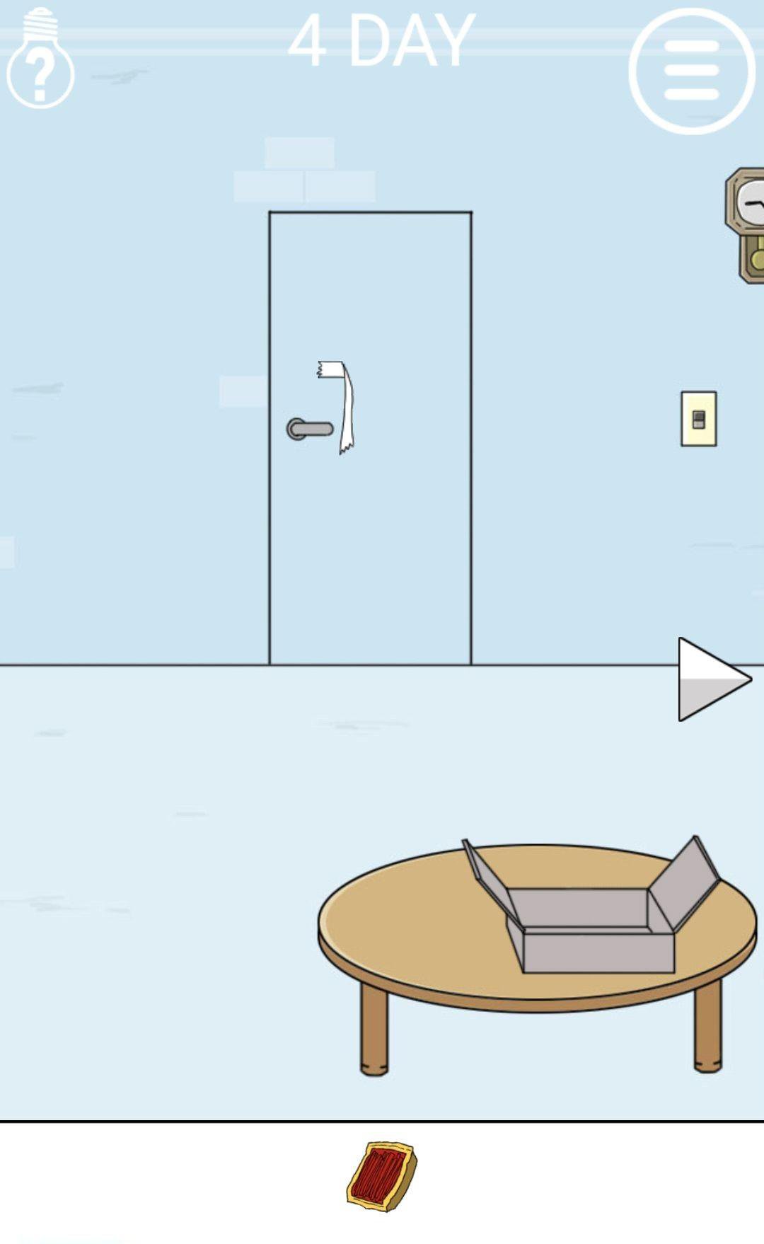 去第二场景,把抽屉拉开,拿到胶带,然后返回第一场景,把胶带贴门上,把辣条放上去,过关