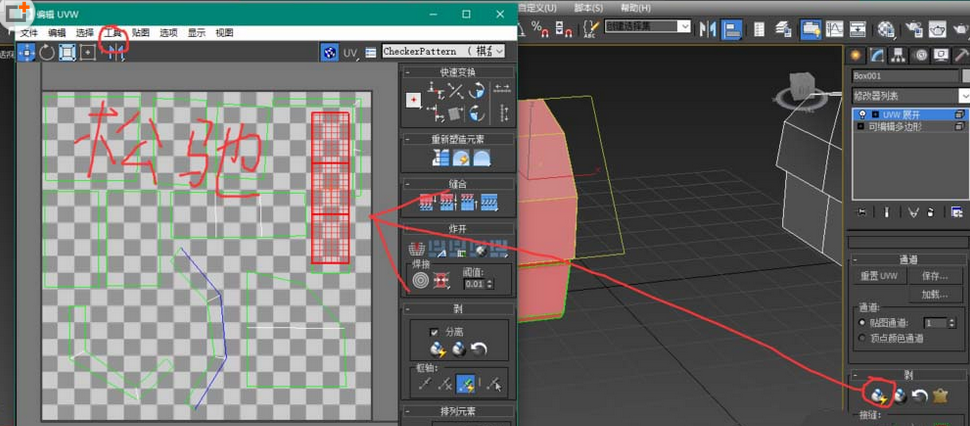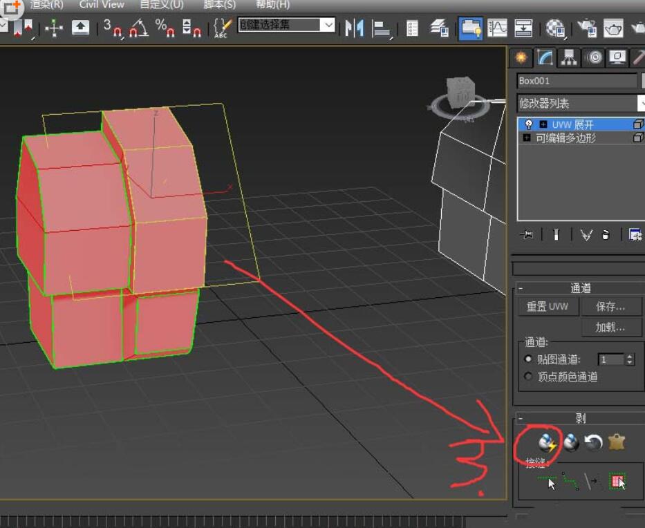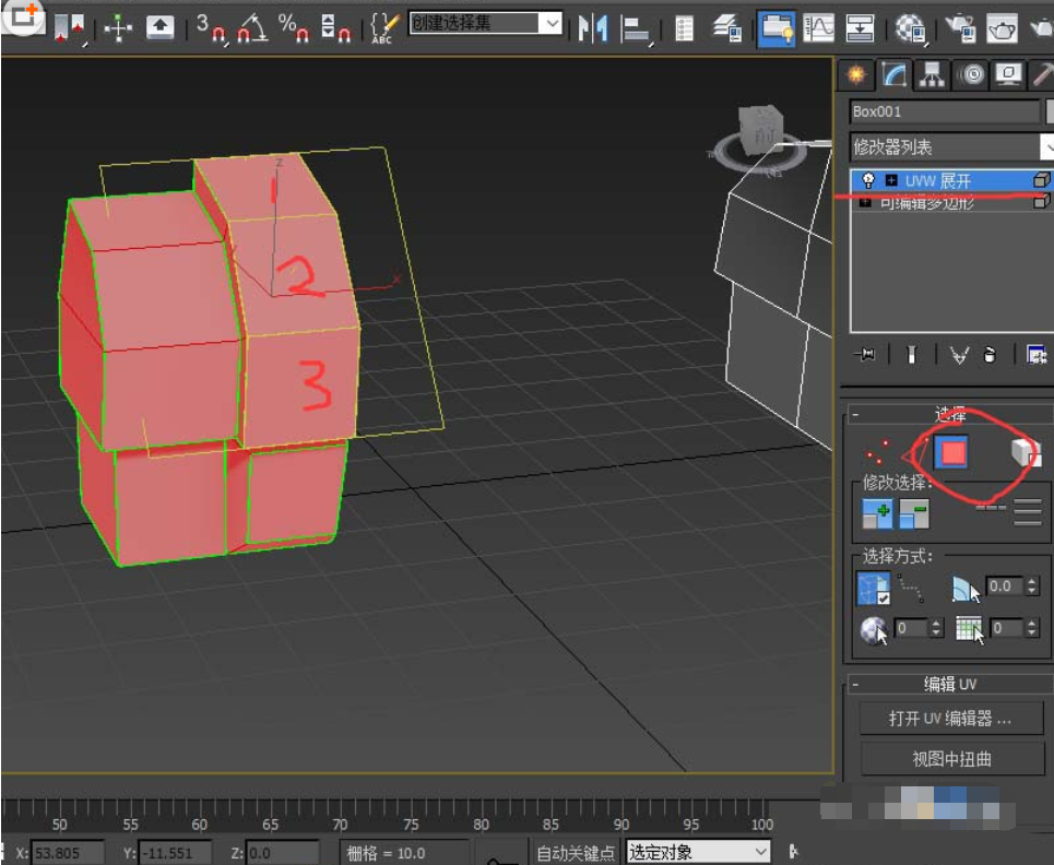 2、打开uvw展开选择面模式选择要分开的面123为例
