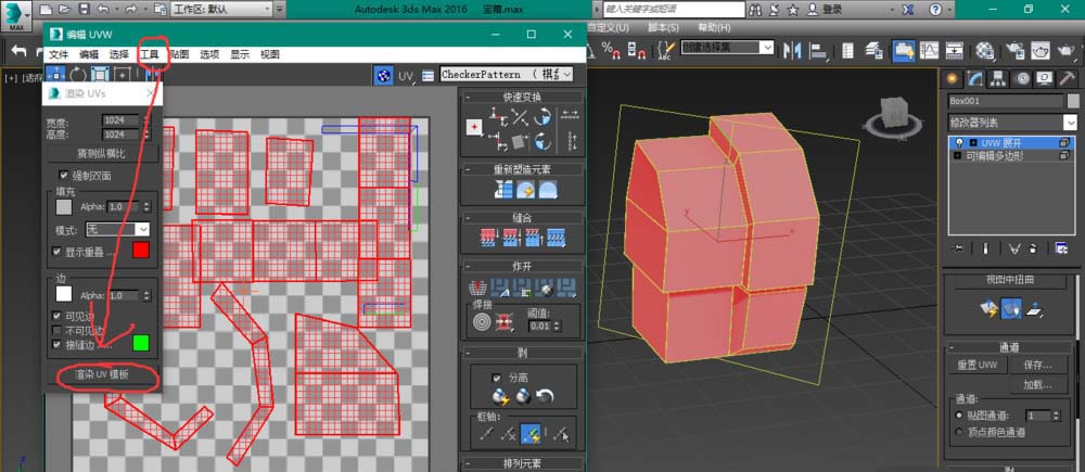 5、展好uv之后,工具渲染uv模板,面与面不要重叠,