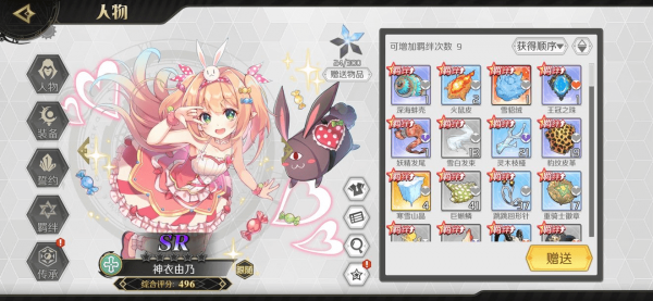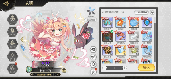 其中也有角色喜欢与否的物品,红心代表喜欢,会增加更多的好感度,紫色裂开的心则代表讨厌,送了加的好感度会少一些