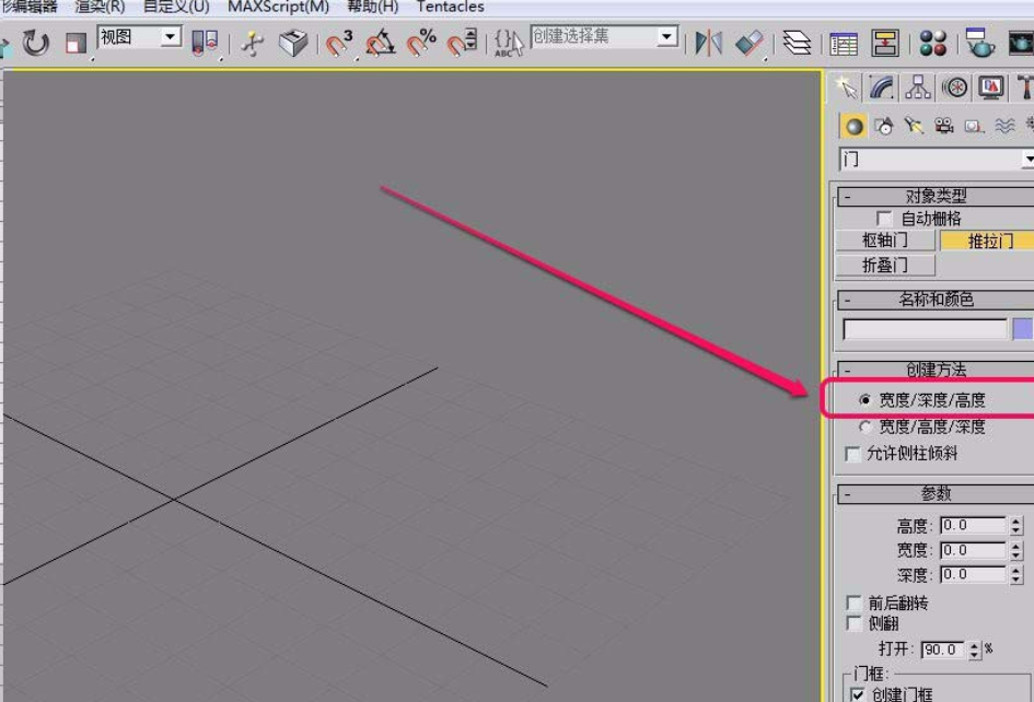 打开“创建方法”卷展栏,选择“宽度/深度/高度”选项。选择这一选项的意思是,把要按照宽度-深度-高度的顺序来创建推拉门。