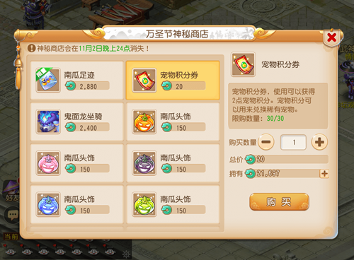活动期间,万圣节商店限时开启,玩家可以购买万圣节相关物品。南瓜灯家具、南瓜头饰、宠物积分券、南瓜足迹等!