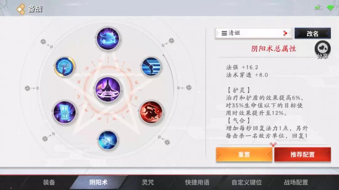 “气合”可以弥补清姬耗蓝较高的缺陷,6级之前释放三技能的压力会变小。基础属性选择法强、法术穿透和移速,可以提升清姬技能的输出伤害,高速移动有利于保持二技能拴住时间更长。2.灵咒选择