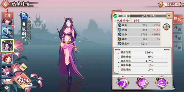 小师妹本身有着s的速度,106的速度在整个游戏中也是佼佼者,所以在斗技和涂山比武中也有一席之地,尤其是涂山比武只能上4个伙伴,大大提高了群攻技能同时打中草人和目标的几率。