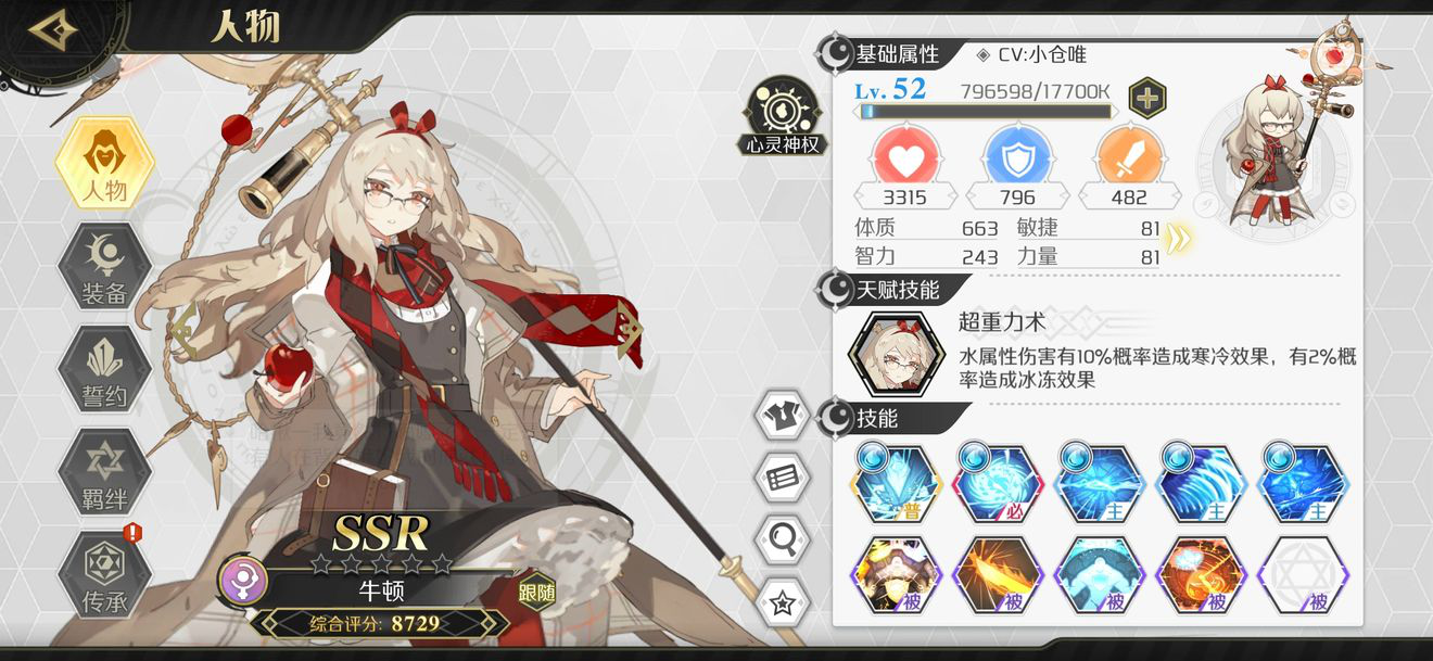 补充说明:有些人可能会不理解为什么牛顿排名这么高,因为她不但有控制而且能聚怪,这在爬塔里是极其重要的,但是牛顿输出确实不会很高,所以建议等级跟上,传承点主点冷却缩减就OK,不必浪费太多的传承点与装备在牛顿上