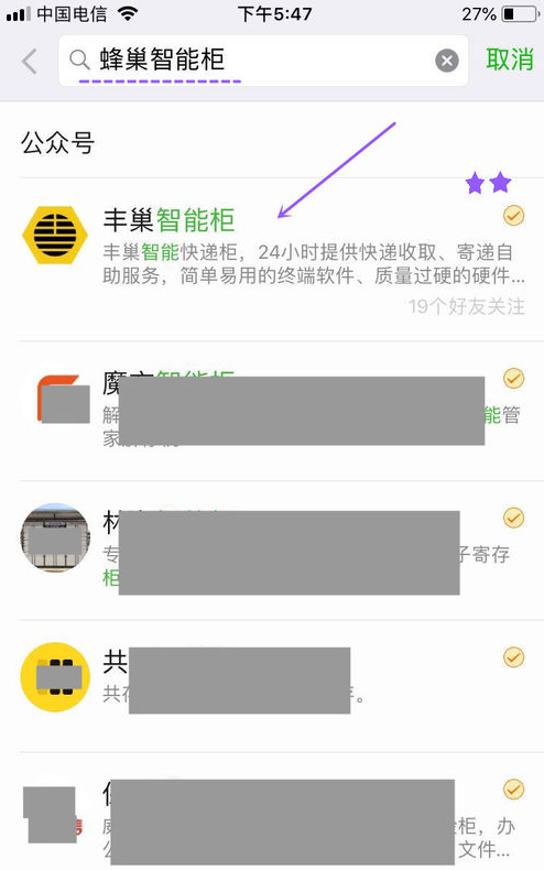 2、然后找到丰巢智能柜的微信公众号,点击打开。