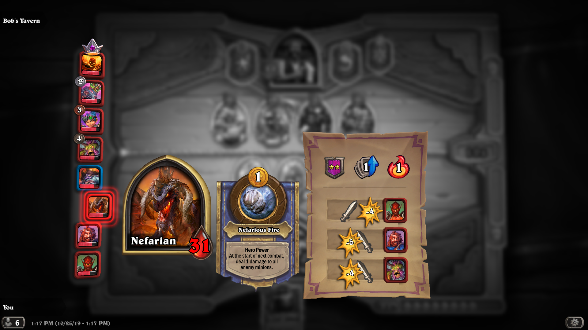 例如,选择米尔菲丝·法力风暴会使鲍勃的酒馆中出现的所有机械随从获得+1/+1,你可以重点招揽机械随从,让米尔菲丝的效果大放异彩。再如,阿尔萨斯可以让你消费一些来之不易的酒馆铸币,使你最右侧的随从获得复生。如果你当上了巫妖王,随从的站位将成为胜利的关键。