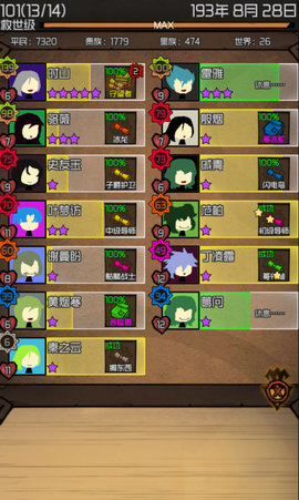 2、新人物两数值,0-140+星数可以理解为潜力等级,到达自己的潜力等级后升级很难。我试过养了一个7潜力的八十多年,最终也就16级。而另一个桃子图案中的数值是寿命,每十年所有人都减一点,高危任务失败也有几率减一点,归零清人物。
