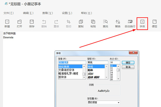 1、用户可以将日常事项以及重要的内容保存到小黑记事本软件上,从而让你在关键时刻不会忘记某些事项,如果你不知道怎么调节文本中的文字,则可以点击上方栏目中的字体;功能选项,在出现的字体设置界面调节字体样式、字形与字体大小,你可以在下方的示例中看到更改完成的字体,调节完成后点击确定即可,如下图所示: