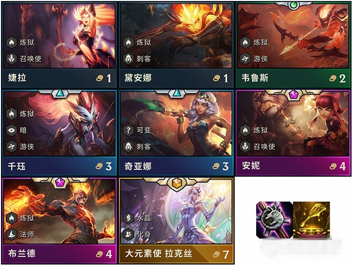 6地狱火3刺客阵容7人口阵容。开局刷火圈,还能拿到地狱火拉克丝和地狱火羁绊装备的话能玩6炼狱6刺客。