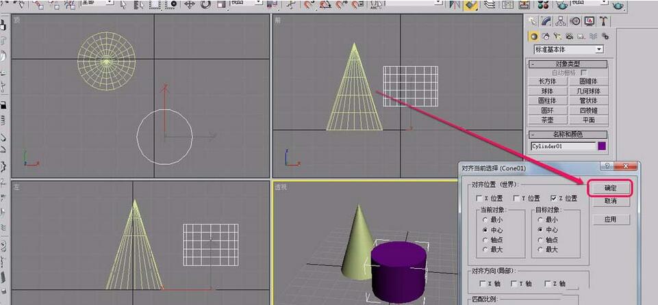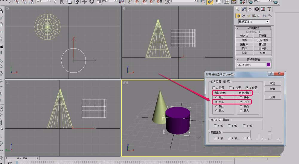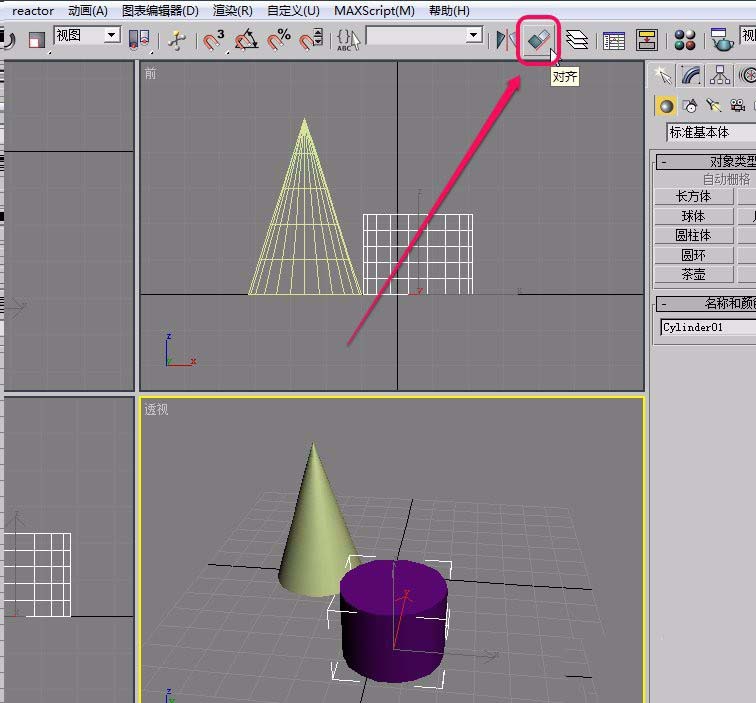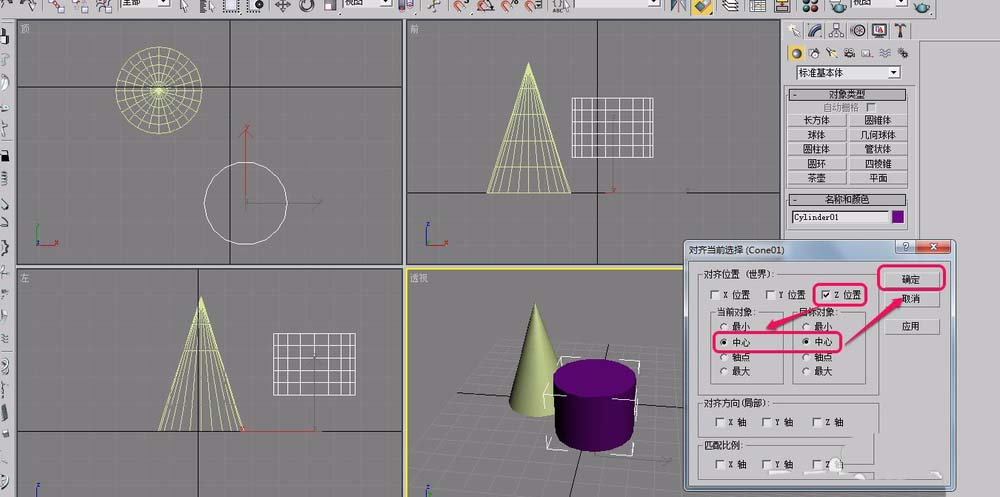 可以看到,圆柱体和圆锥体在Z轴方向上已中心对齐了。