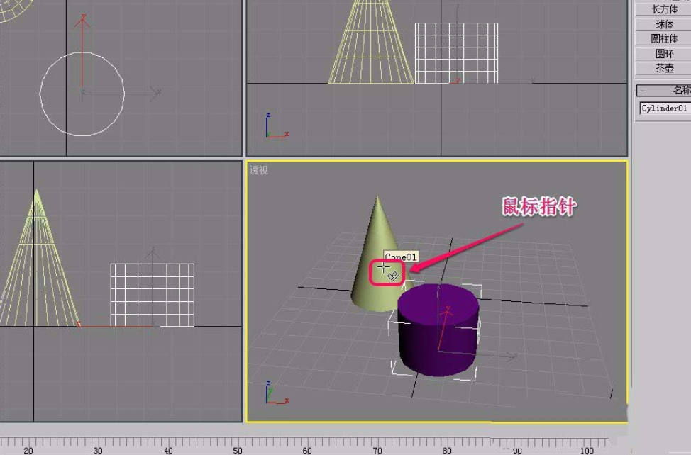 移动鼠标指针到圆锥体上面。当鼠标指针变成图示的形状后,单击鼠标。