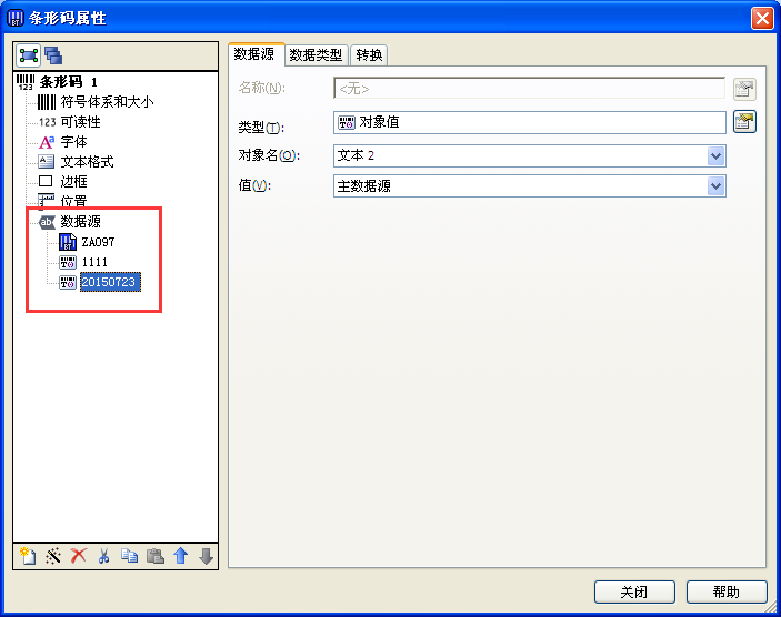创建Code 128条码(ZA097),双击条码,弹出“条形码属性”对话框,点击左下角“新建数据源”按钮;