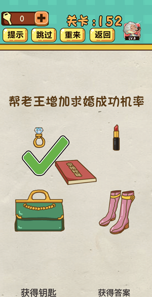 神脑洞游戏152关要求玩家帮助老王求婚,很多玩家对着一堆求婚物品摸不着头脑。第152关的问题是:帮老王增加求婚成功几率?赶快来看下正确答案,以及相对应的答案解析吧。