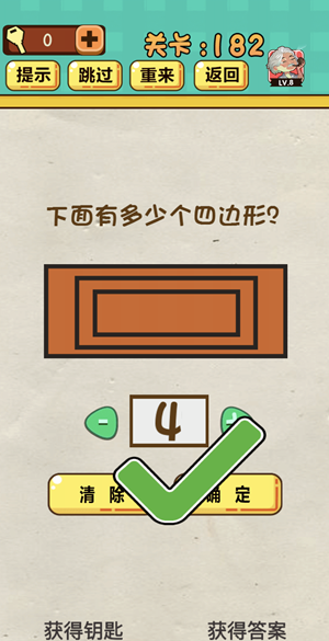 神脑洞游戏第182关的问题是:下面有多少个四边形?这是道看图数四边形的问题,虽然难度不大,但也有很多玩家出错。下面赶快来看下正确答案,以及相对应的答案解析吧。