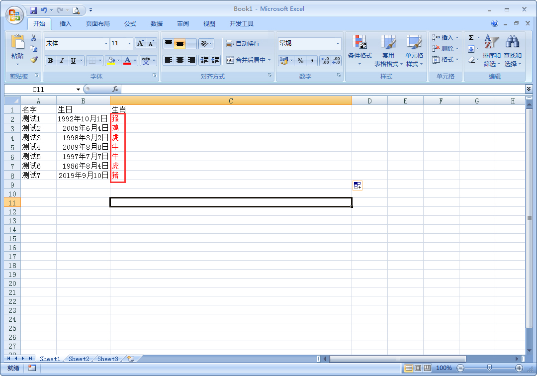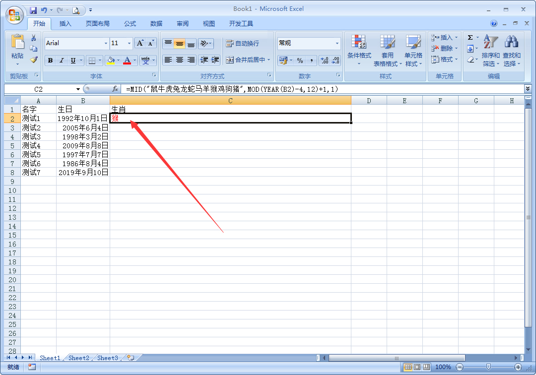 在生肖的表格中输入函数公式“=MID(“鼠牛虎兔龙蛇马羊猴鸡狗猪”,MOD(YEAR(生日日期所在的格子)-4,12)+1,1)”;