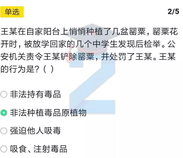 2、王某在自家阳台上偷偷种植了几盆罂粟,罂粟花开时,被放学回家的几个中学生发现后检举,公安机关责令王某铲除罂粟,并处罚了王某,王某的行为是?